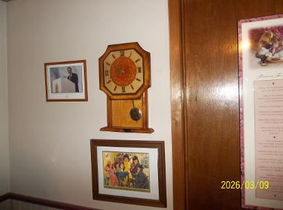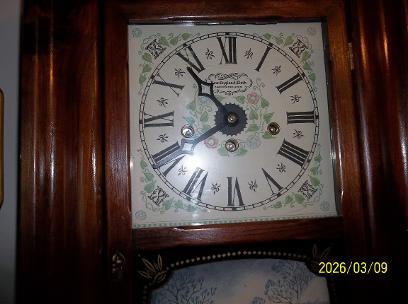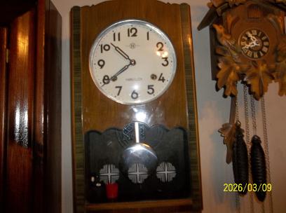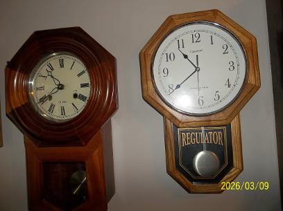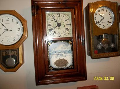 The three wooden wall clocks above are all Quartz battery operated the light oak Regulater clock $125.00.The light oak one has dancers at the bottom that turn all the time $150.00 your Choice.The weight clock is made in Germany and strikes on the 1/2 hour and the hour in fine working order $200.00.